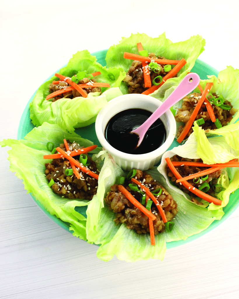 To serve, take a leaf of lettuce, fill it with the lentil-walnut mixture, top with carrot, green onions, and sesame seeds, and spoon as much sauce as desired over it all. Fold it like a taco and munch away!