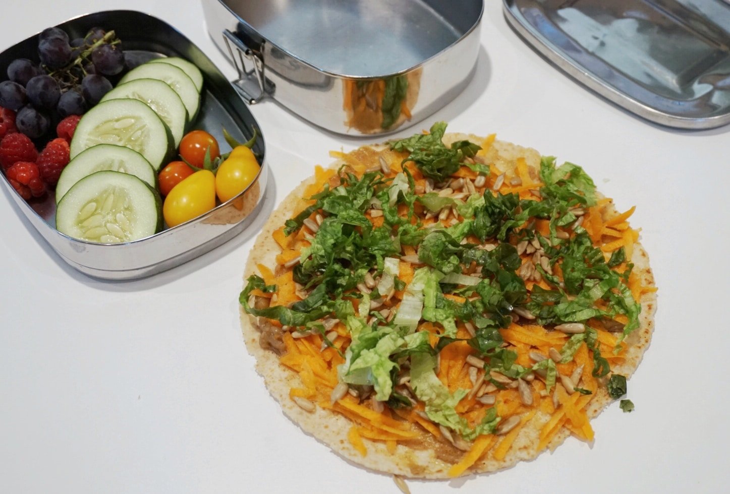 There are endless variations on the wrap but the basics are to start with something sticky as kind of a binder that will hold the rest of the toppings. Some ideas are: hummus, other bean spreads, quark cheese or homemade yogurt cheese, light cream cheese, butter, sunflower seed butter or pumpkin seeds butter (peanut butter or other nut butters if not against school policy) etc. The next step is to add your toppings, depending what you started with it might be grated carrots, thinly sliced cucumbers (slicing with a peeler works well), thinly sliced roasted vegetables, grated cheese or cheese alternative, meat or meat alternatives, pumpkin, sesame or sunflower seeds.